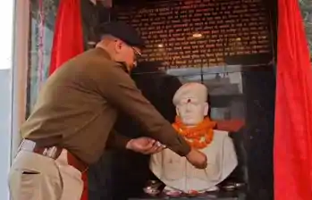 Hajipur - बैंक लूट के दौरान अदम्य साहस का परिचय देते हुए अपनी जान कुर्बान करने वाले शहीद जवान अमिताभ बच्चन की शहादत को बिहार पुलिस ने नमन किया। सराय थाना परिसर में आयोजित एक भावुक समारोह में बिहार पुलिस महानिदेशक (DGP) विनय कुमार ने शहीद जवान की आदमकद प्रतिमा का अनावरण किया। इस मौके पर उन्होंने शहीद की पत्नी को नियुक्ति पत्र सौंपा और विभाग की ओर से लगभग 43 लाख रुपये की अनुग्रह राशि प्रदान की।