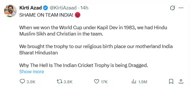 कीर्ति आजाद, जो 1983 की ऐतिहासिक विश्व कप विजेता टीम का हिस्सा रहे हैं, उन्होंने सोशल मीडिया पर लिखा-“टीम इंडिया पूरे भारत की नुमाइंदगी करती है, किसी एक धर्म या खानदान की नहीं।” उन्होंने याद दिलाया कि 1983 की टीम में हर मजहब के खिलाड़ी थे, हिंदू, मुस्लिम, सिख और ईसाई और उस वक्त ट्रॉफी पूरे देश की जीत मानी गई थी, किसी धार्मिक पहचान की नहीं।