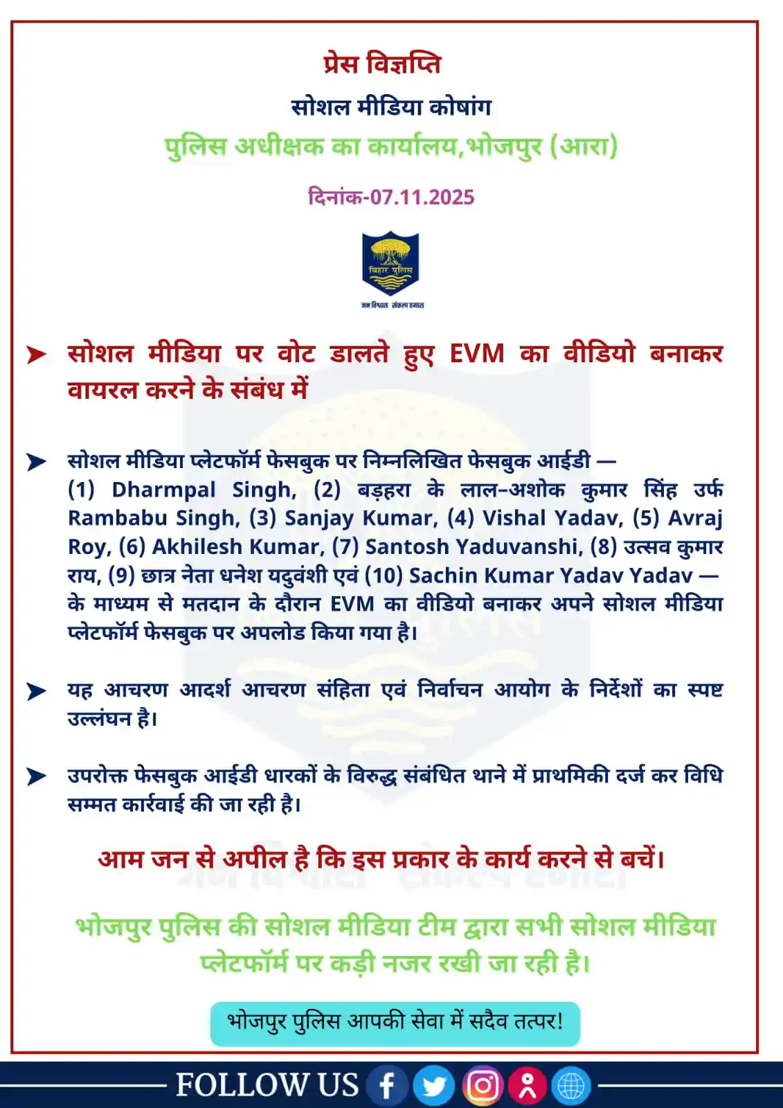 भोजपुर पुलिस ने आम मतदाताओं से अपील की है कि मतदान केंद्र पर वोट डालते समय किसी भी प्रकार की फोटोग्राफी या वीडियोग्राफी से बचें। मतदान एक गोपनीय प्रक्रिया है, और उसकी सुरक्षा हर नागरिक की जिम्मेदारी है। प्रशासन का कहना है कि इस तरह की घटनाएं न केवल आचार संहिता का उल्लंघन करती हैं, बल्कि यह लोकतांत्रिक मूल्यों पर भी सवाल उठाती हैं।