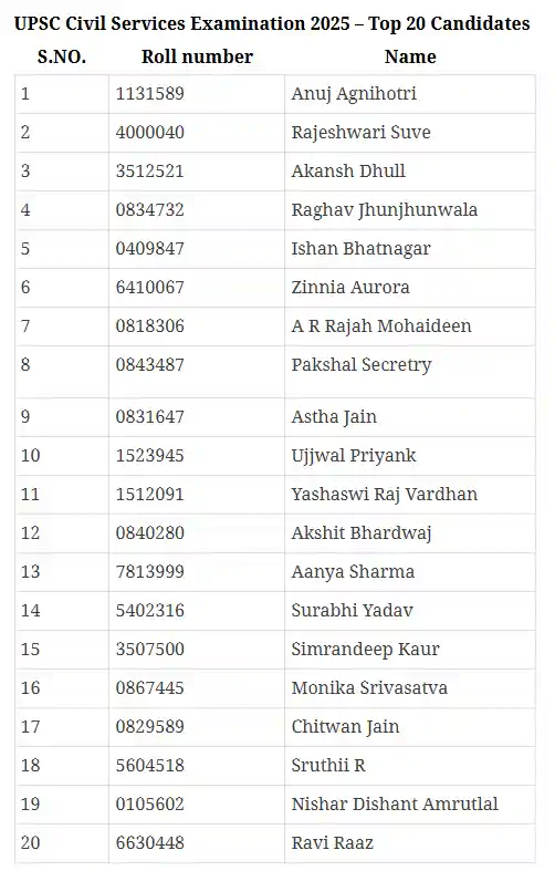 UPSC : संघ लोक सेवा आयोग ने सिविल सेवा परीक्षा 2025 का अंतिम परिणाम घोषित कर दिया है। इस वर्ष राजस्थान के चित्तौड़गढ़ निवासी Anuj Agnihotri ने अखिल भारतीय स्तर पर प्रथम स्थान (AIR-1) प्राप्त किया है। वहीं बिहार की मोनिका श्रीवास्तव ने शानदार प्रदर्शन करते हुए पूरे देश में 16वां स्थान हासिल किया है।