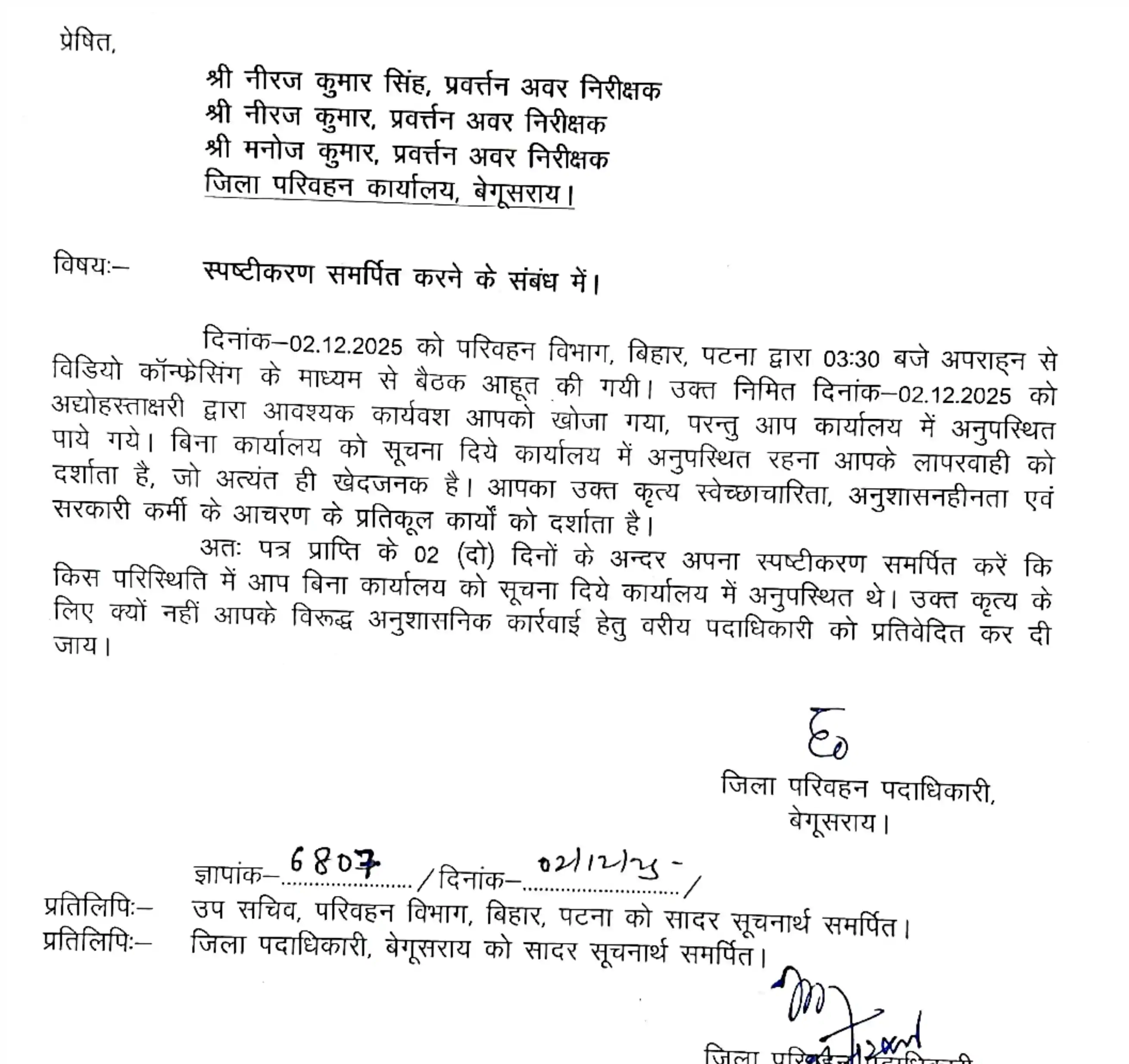 बेगूसराय जिला परिवहन कार्यालय (DTO) में कार्यरत तीन प्रवर्तन अवर निरीक्षकों— नीरज कुमार सिंह, नीरज कुमार, और मनोज कुमार पर लापरवाही और अनुशासनहीनता का गंभीर आरोप लगा है। जिला परिवहन पदाधिकारी (DTO) ने ज्ञापांक 6803/दिनांक-02/12/2025 के तहत इन तीनों अधिकारियों को कारण बताओ नोटिस जारी किया है। यह कार्रवाई इसलिए की गई क्योंकि 02 दिसंबर 2025 को अपराह्न 3:30 बजे परिवहन विभाग, बिहार, पटना द्वारा आयोजित वीडियो कॉन्फ्रेसिंग (VC) बैठक के दौरान, जब DTO ने उन्हें आवश्यक कार्यवश खोजा, तो वे बिना किसी पूर्व सूचना के कार्यालय से अनुपस्थित पाए गए ।