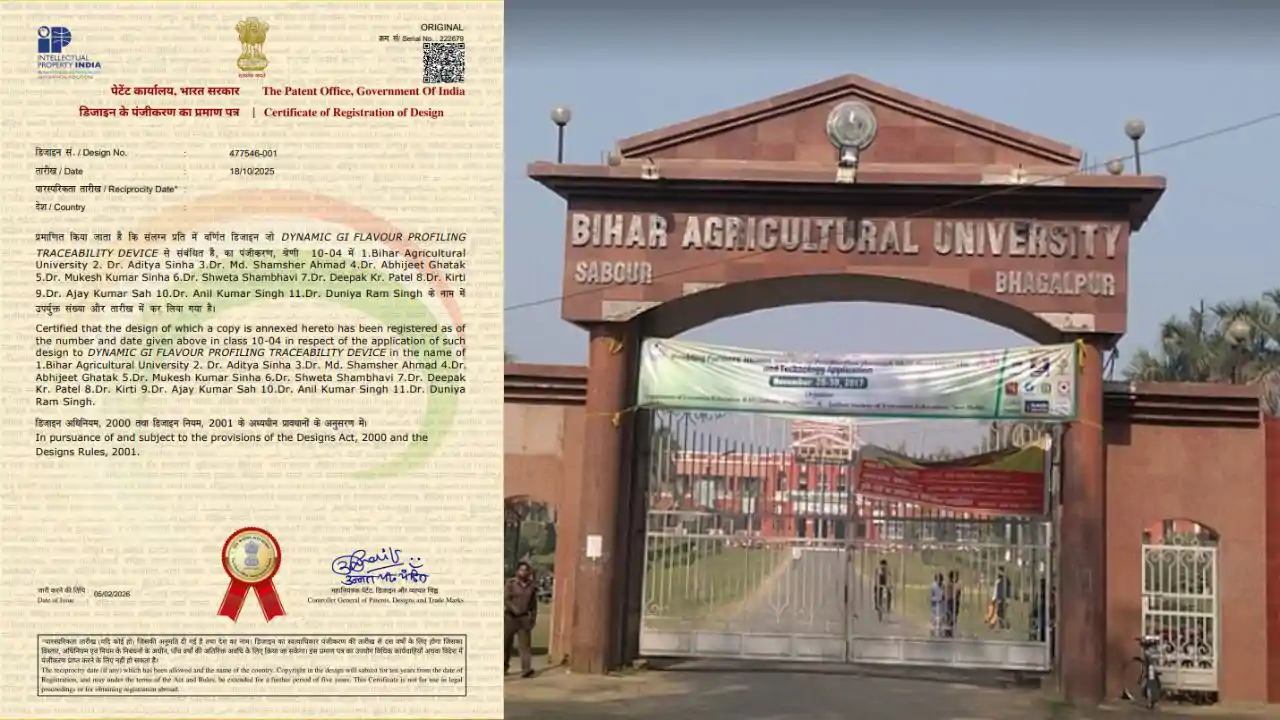 Bhagalpur - : बिहार कृषि विश्वविद्यालय (BAU), सबौर ने कृषि तकनीक और नवाचार के क्षेत्र में एक नया इतिहास रच दिया है। भारत सरकार के भारतीय पेटेंट कार्यालय ने विश्वविद्यालय द्वारा विकसित “डायनेमिक जीआई फ्लेवर प्रोफाइलिंग ट्रेसबिलिटी डिवाइस” को आधिकारिक तौर पर डिज़ाइन पंजीकरण प्रदान किया है। यह मान्यता इस उपकरण की मौलिकता और इसकी कार्यक्षमता को प्रमाणित करती है।