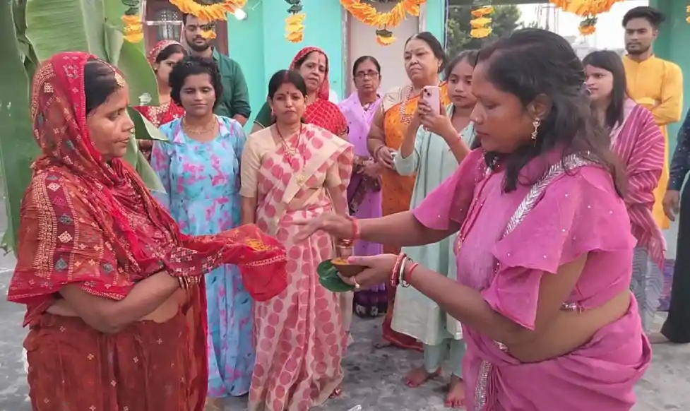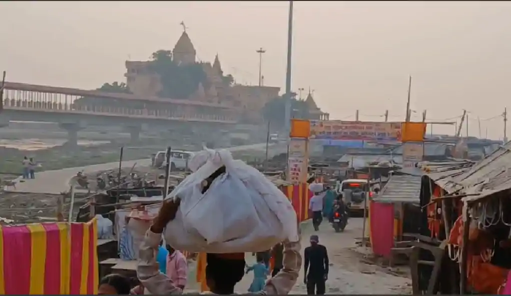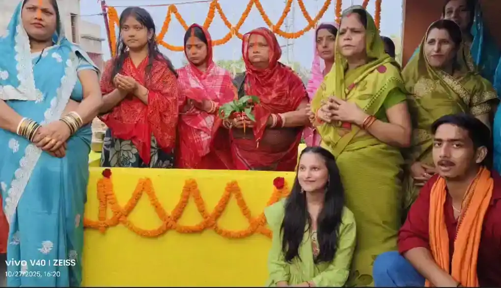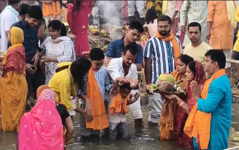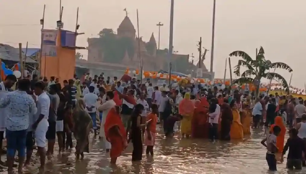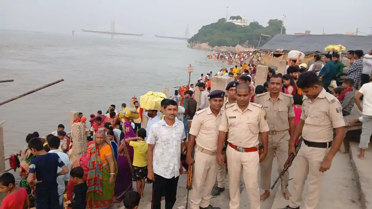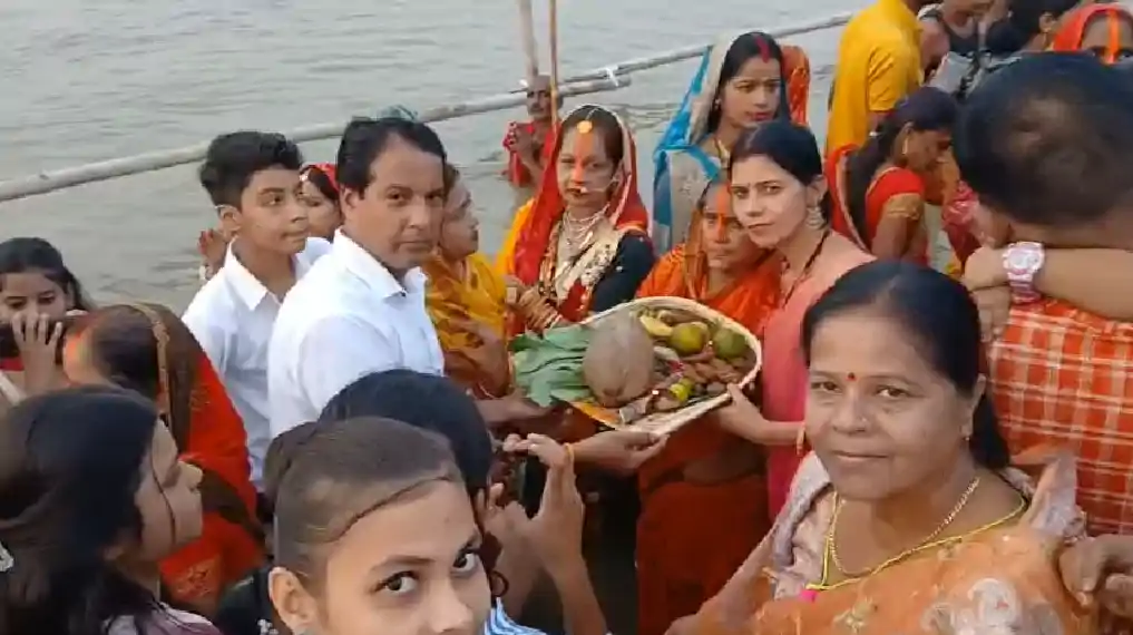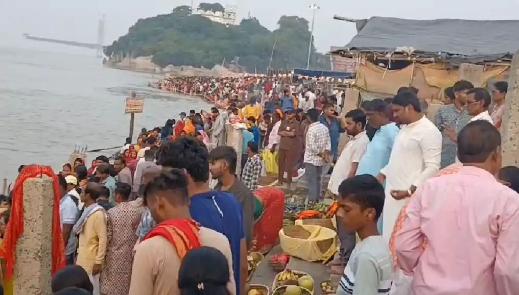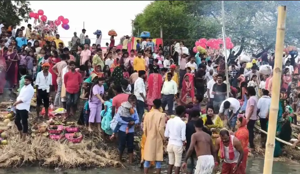 छठ पूजा की पहली अर्घ्य अस्तगामी सूर्य को देने अजगैबिनाथ गंगा घाट में हजारों श्रद्धालुओं की भीड़ उमड़ी