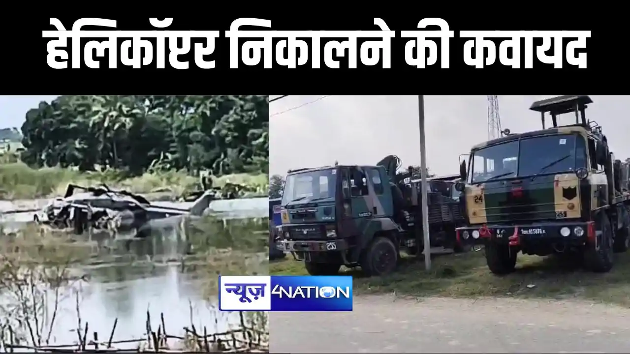 मुजफ्फरपुर में इमरजेंसी लैंडिंग के बाद हेलिकॉप्टर को पानी से निकालने में जुटे सेना के जवान, देखने के लिए उमड़ी लोगों की भीड़