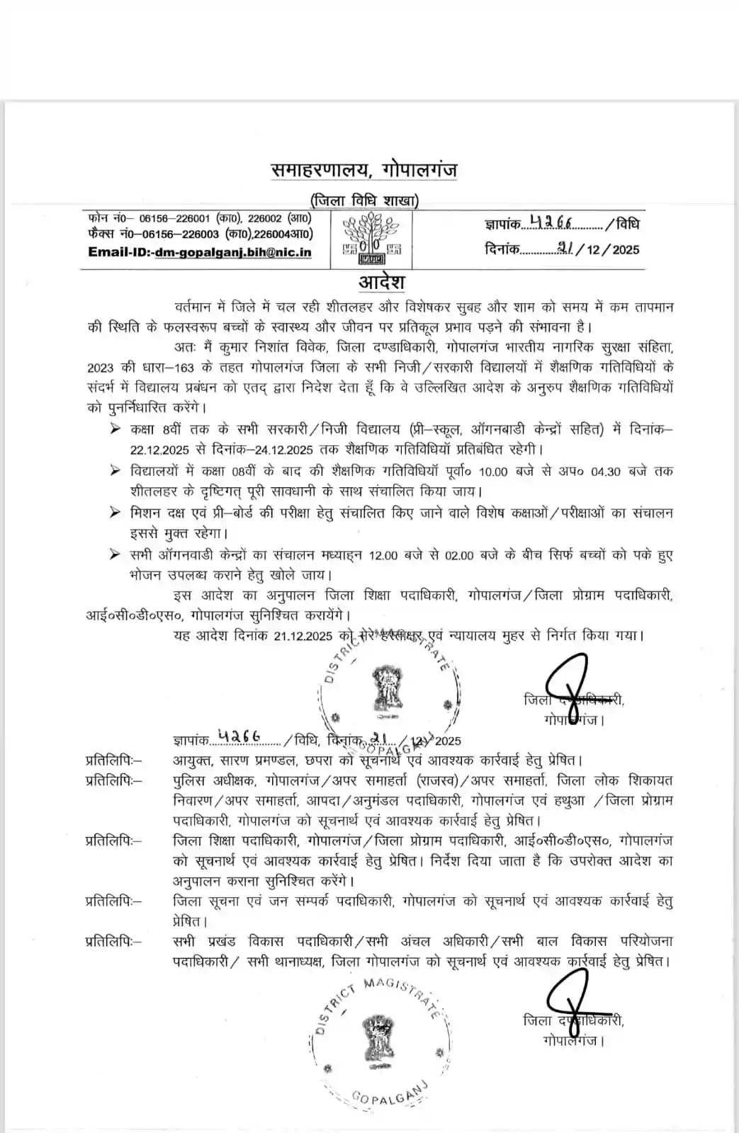 Gopalganj School Closed: गोपालगंज जिले में बढ़ती ठंड और शीतलहर को देखते हुए जिला प्रशासन ने 22 से 24 दिसंबर तक सभी सरकारी और निजी स्कूल, प्री-स्कूल व आंगनबाड़ी केंद्र बंद करने का आदेश जारी किया है।