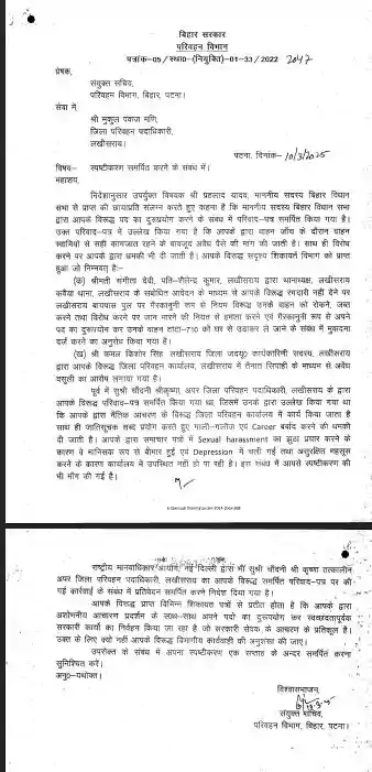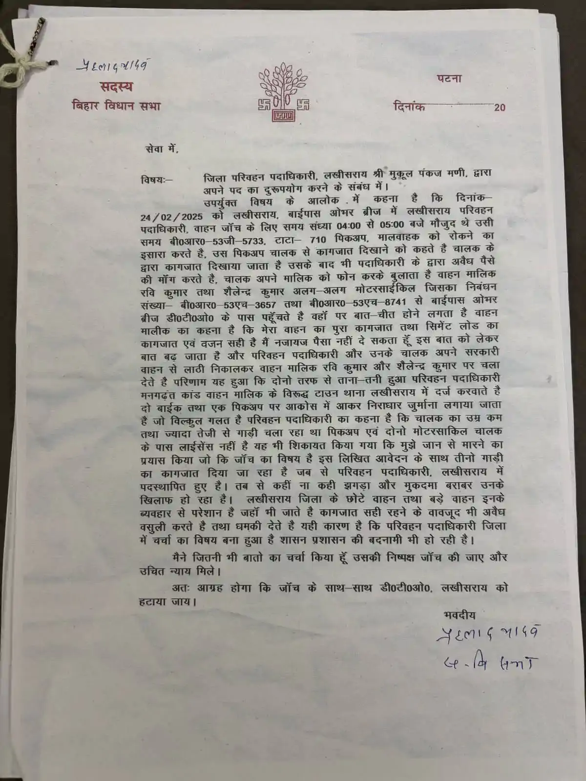 मामले की गंभीरता को देखते हुए परिवहन विभाग के सचिव ने लखीसराय डीटीओ से स्पष्टीकरण तलब किया है। सचिव के पत्र में साफ उल्लेख है कि विधायक प्रहलाद यादव द्वारा डीटीओ पर पद के दुरुपयोग का परिवाद दिया गया है। पत्र के अनुसार, वाहन जांच के दौरान सही कागजात होने के बावजूद अवैध धन की मांग और विरोध करने पर धमकी दिए जाने के आरोप हैं।
