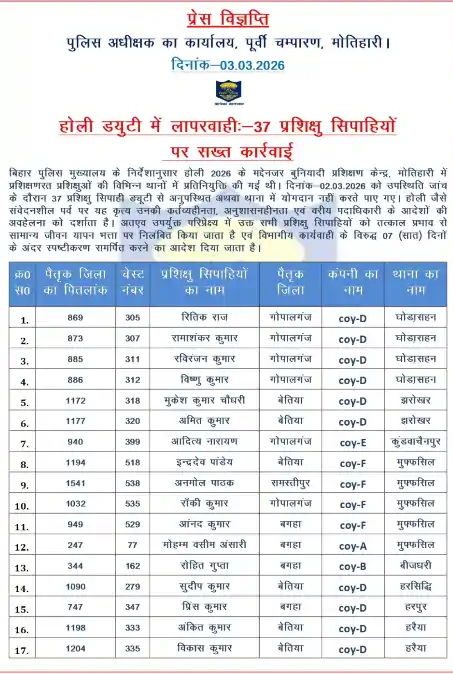 Bihar Police: होली से पहले पुलिस महकमे में बड़ी कार्रवाई ने सनसनी फैला दी है। मोतिहारी में बिना पूर्व सूचना ड्यूटी से गायब रहने वाले 37 सिपाहियों को एसपी स्वर्ण प्रभात ने तत्काल प्रभाव से निलंबित कर दिया है। इस सख्त कदम के बाद पूरे जिले में खाकी महकमे में हड़कंप मच गया है।