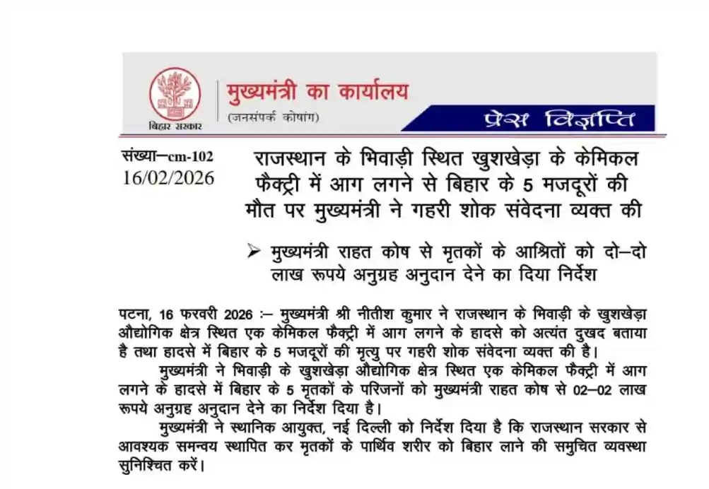 भिवाड़ी स्थित खुशखेड़ा औद्योगिक क्षेत्र में केमिकल फैक्ट्री में लगी भीषण आग में सात मजदूरों की मौत हुई, जिनमें पांच बिहार के मोतिहारी के रहने वाले थे। बिहार के मुख्यमंत्री नीतीश कुमार ने गहरी शोक संवेदना व्यक्त करते हुए इसे अत्यंत दुखद बताया है।