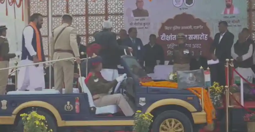 जैसे ही निरीक्षण की प्रक्रिया शुरू हुई, एक महिला दरोगा ने मुख्यमंत्री नीतीश कुमार से औपचारिक तौर पर कहा “सर, आप निरीक्षण के लिए तैयार हैं।” इसके बाद राज्य के डीजीपी विनय कुमार मुख्यमंत्री को लेकर उस जीप की ओर बढ़े, जिससे परेड का निरीक्षण होना था। मुख्यमंत्री जीप पर चढ़े, डीजीपी भी साथ चढ़ गए यहां तक सब कुछ नियमों के दायरे में था।