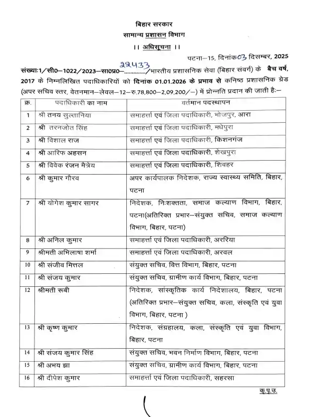 Patna : बिहार सरकार ने भारतीय प्रशासनिक सेवा (IAS) के अधिकारियों को नए साल का तोहफा देते हुए बड़े पैमाने पर प्रोन्नति दी है। सामान्य प्रशासन विभाग द्वारा जारी अधिसूचना के अनुसार, वर्ष 2017 बैच के 16 आईएएस अधिकारियों को 'कनिष्ठ प्रशासनिक ग्रेड' (Junior Administrative Grade) में प्रोन्नति दी गई है। इसके तहत अब ये अधिकारी अपर सचिव स्तर (Additional Secretary Level) के वेतनमान और सुविधाओं के हकदार होंगे। इस लिस्ट में भोजपुर, मधेपुरा, किशनगंज और सहरसा समेत कई जिलों के जिलाधिकारी (DM) शामिल हैं।