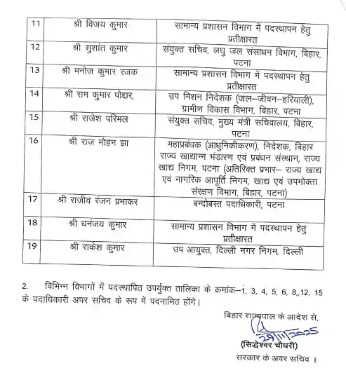 प्रोन्नत होने वाले 19 अधिकारियों की सूची में लोक स्वास्थ्य अभियंत्रण विभाग के अरविंद कुमार, भवन निर्माण विभाग के विनय कुमार, सहकारिता विभाग के अभय कुमार सिंह और सूचना एवं जन-संपर्क विभाग के राजीव कुमार सिंह जैसे वरिष्ठ अधिकारी शामिल हैं । इसके अलावा, मुख्यमंत्री सचिवालय के संयुक्त सचिव राजेश परिमल और दिल्ली नगर निगम में प्रतिनियुक्त राकेश कुमार को भी इस प्रोन्नति का लाभ मिला है । सरकार ने स्पष्ट किया है कि विभिन्न विभागों में कार्यरत इन अधिकारियों को अब 'अपर सचिव' (Additional Secretary) के रूप में पदनामित किया जाएगा ।