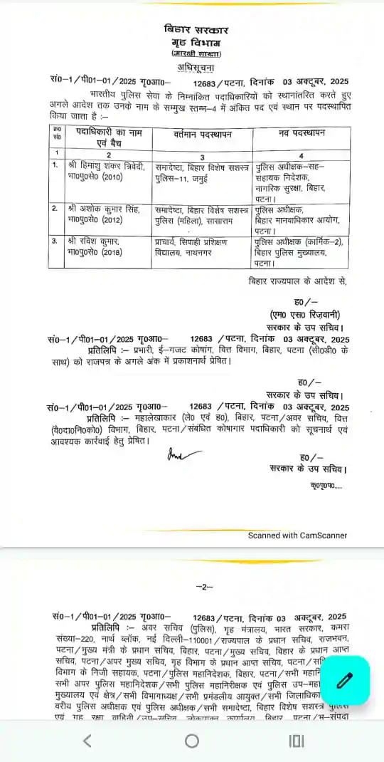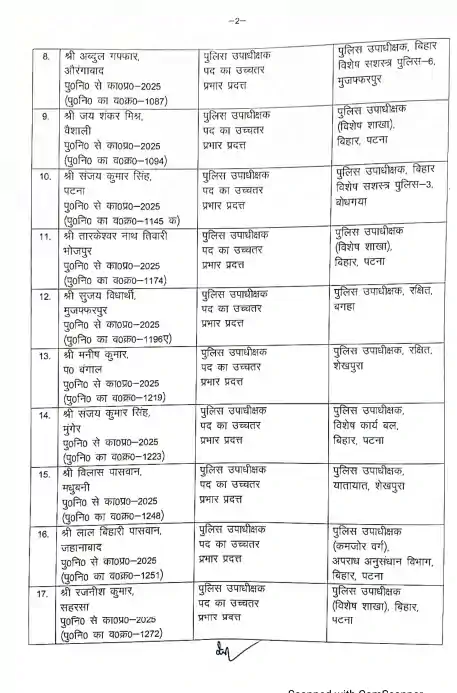 इसी तरह सिपाही प्रशिक्षण विद्यालय नाथनगर के प्राचार्य 2018 बैच के आईपीएस रविश कुमार को बिहार पुलिस मुख्यालय(कार्मिक -2) का एसपी बनाया गया है।