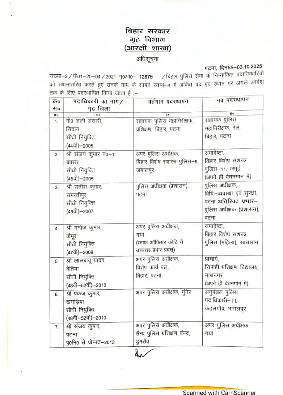 Bihar police transfer - बिहार गृह विभाग ने चुनाव की घोषणा होने से पहले पुलिस महकमे में बड़ी संख्या में अधिकारियों का ट्रासफर किया है। जिसको लेकर नोटिफिकेशन जारी किया गया है।