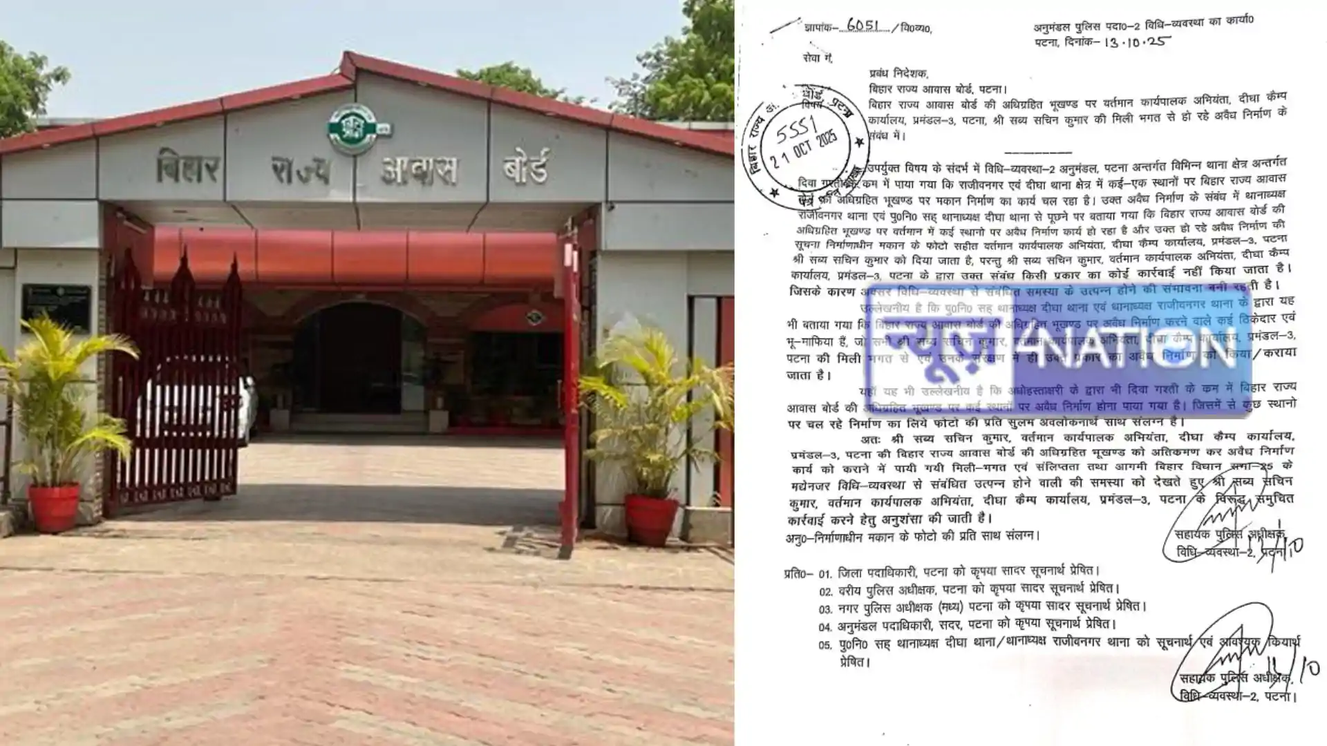 पटना पुलिस के विधि व्यवस्था एसडीपीओ-2 द्वारा बिहार राज्य आवास बोर्ड के प्रबंध निदेशक को लिखे गए एक गोपनीय पत्र ने विभाग में खलबली मचा दी है। इस पत्र (ज्ञापांक सं-6051, दिनांक 13.10.25) में पटना के राजीव नगर और दीघा थाना क्षेत्रों में हो रहे अवैध निर्माणों का कच्चा चिट्ठा खोला गया है। पत्र में स्पष्ट रूप से आवास बोर्ड के वर्तमान एसडीओ सत्य सचिन की भूमिका पर गंभीर सवाल उठाए गए हैं और अवैध निर्माण को रोकने में विफलता का उल्लेख किया गया है।