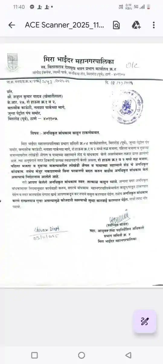 खेसारी लाल यादव को ये नोटिस 3 नवंबर को जारी हुआ, जिसमें लिखा है मीरा रोड पर जुन्या पेट्रोल पंप के पास स्थित शत्रुघ्न कुमार यादव उर्फ खेसारी लाल यादव के बंगले में निर्माण के मानक नियमों का उल्लंघन किया गया है।
