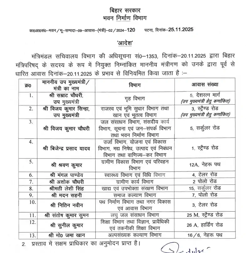 Patna - मंत्रिमंडल सचिवालय ने जारी की अधिसूचना बिहार सरकार के मंत्रिमंडल सचिवालय विभाग ने राज्य कैबिनेट के मंत्रियों के लिए सरकारी आवास (बंगलों) की नई आवंटन सूची जारी कर दी है। विभाग द्वारा जारी दो अलग-अलग आदेशों में नवनियुक्त मंत्रियों को पटना केंद्रीय पूल से आवास आवंटित किए गए हैं, जबकि उपमुख्यमंत्री और कुछ वरिष्ठ मंत्रियों के पूर्व से धारित आवासों को विनियमित (Regularize) किया गया है। यह आदेश 20 नवंबर 2025 के प्रभाव से लागू माना जाएगा।