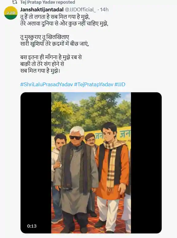 कार्यक्रम के बाद तेज प्रताप ने X पर लिखा कि लंबे अरसे बाद पिता से मिलना उनके लिए किसी नेमत से कम नहीं है। अब एक बार फिर जनशक्ति जनता दल के X हैंडल से साझा की गई AI जनरेटेड तस्वीर को उन्होंने री-पोस्ट किया है। तस्वीर में लालू प्रसाद के साथ दिखते हुए भावुक पंक्तियां लिखी हैं—“तू है तो लगता है सब मिल गया है मुझे… तेरे अलावा दुनिया से और कुछ नहीं चाहिए मुझे।”