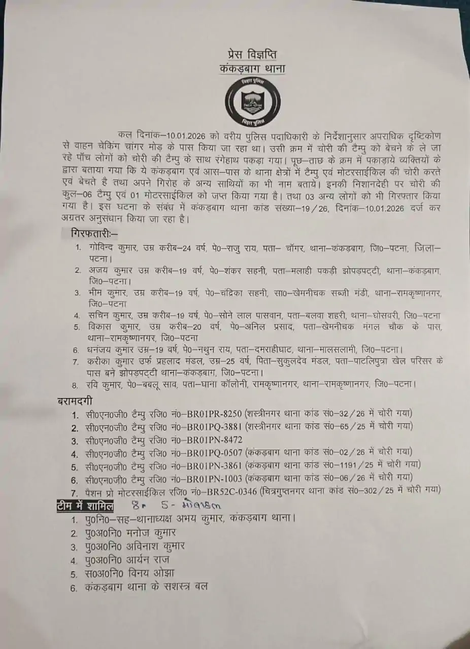 वरीय पुलिस पदाधिकारी के निर्देश पर वाहन चेकिंग के दौरान कंकड़बाग क्षेत्र में कार्रवाई की गई। इसी क्रम में चोरी के ऑटो को बेचने के लिए ले जा रहे पांच लोगों को रंगे हाथ पकड़ा गया। पूछताछ में आरोपियों ने स्वीकार किया कि वे कंकड़बाग और आसपास के थाना क्षेत्रों से सीएनजी ऑटो और मोटरसाइकिल की चोरी कर उन्हें बेचते थे। पूछताछ के दौरान उन्होंने अपने अन्य साथियों के नाम भी बताए, जिसके आधार पर आगे की कार्रवाई करते हुए कुल 8 आरोपियों को गिरफ्तार किया गया।