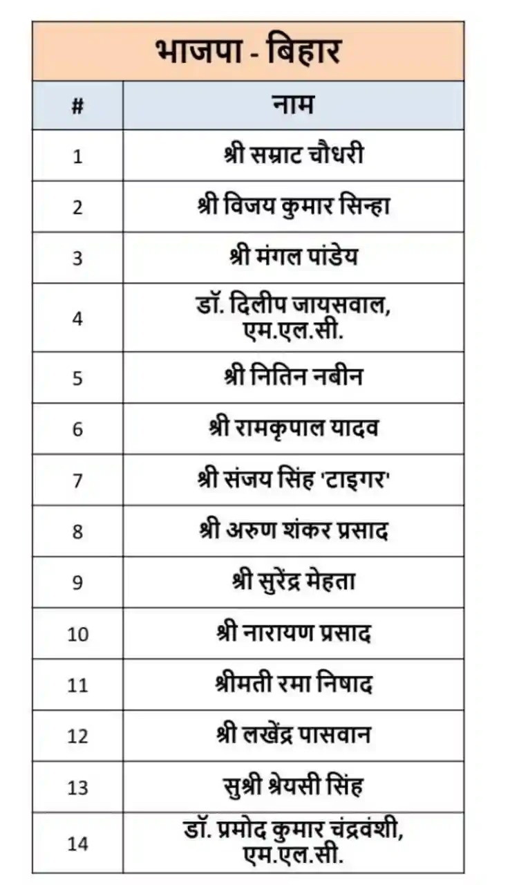 बीजेपी से रामकृपाल यादव, श्रेयसी सिंह, संजय टाइगर, नारायण शाह, रामा निषाद, नितिन नवीन, सुरेंद्र मेहता, लखेंद्र पासवान, अरुण शंकर प्रसाद, प्रमोद चंद्रवंशी का नाम फाइनल बताया जा रहा है. JDU से इन 5 विधायकों को फोन जाने की खबर है इसमें श्रवण कुमार, बिजेंद्र यादव, विजय चौधरी, अशोक चौधरी, लेसी सिंह वहीं उपेंद्र कुशवाहा के बेटे दीपक प्रकाश को भी मंत्री बनाया जाएगा. साथ ही हम से संतोष सुमन और चिराग की पार्टी से भी मंत्री बनेंगे.