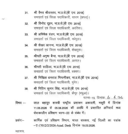 Bihar IAS Training Mussoorie - बिहार के 18 जिलों के डीएम सहित 38 आईएएस अधिकारी 11 मई से मसूरी में अनिवार्य MCTP ट्रेनिंग पर जाएंगे। 11 अप्रैल तक पंजीकरण अनिवार्य। पदोन्नति के लिए यह प्रशिक्षण है आवश्यक।