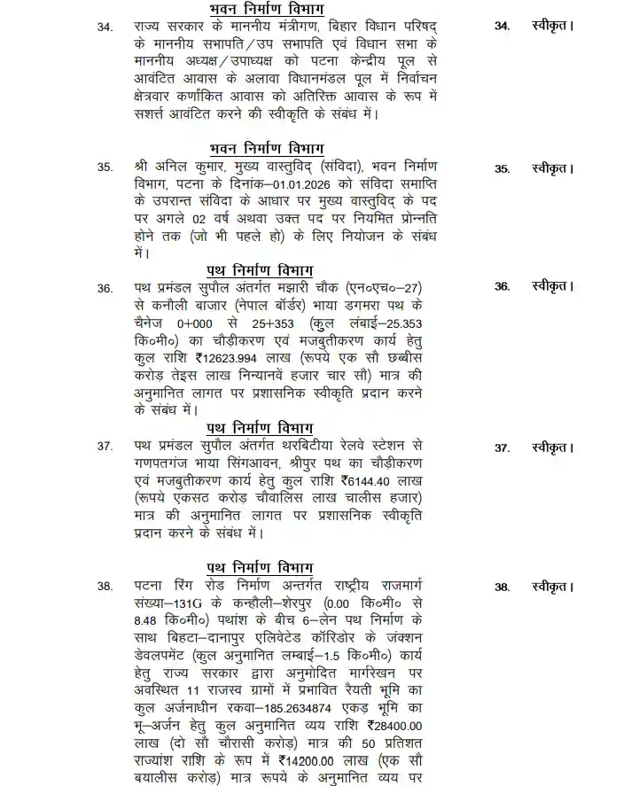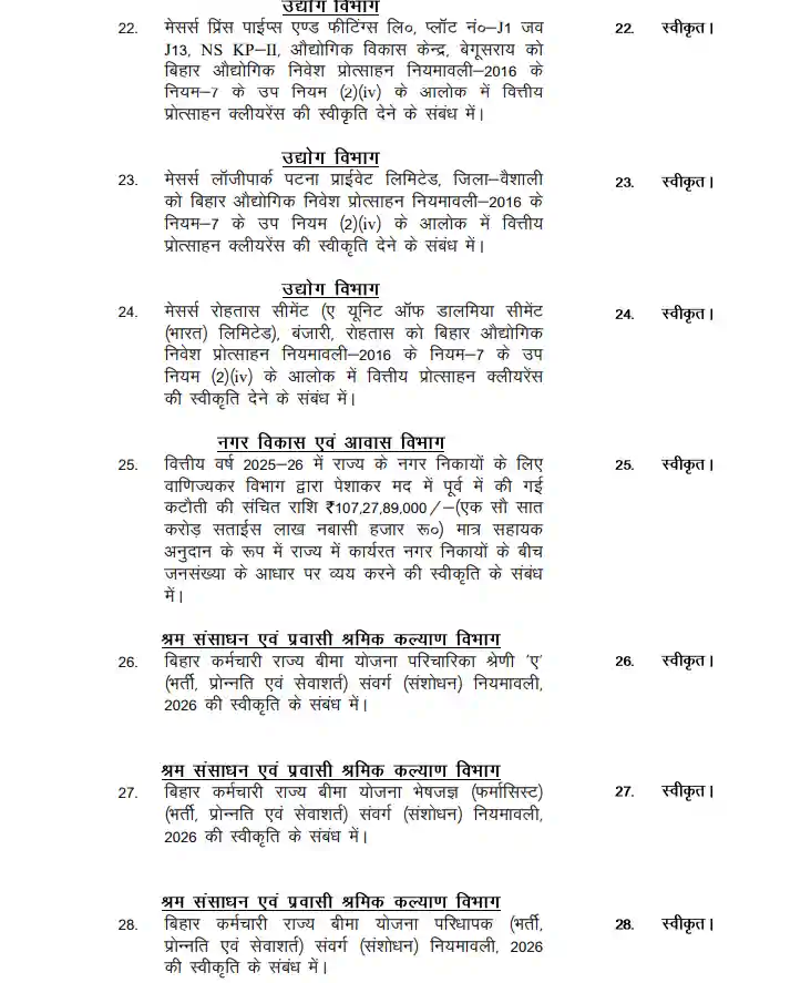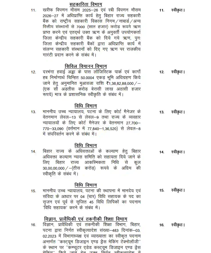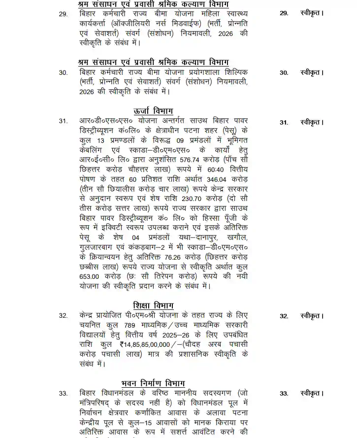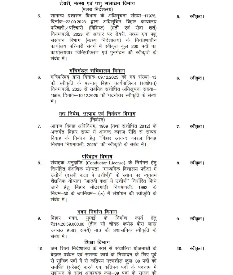 Bihar cabinet : सीएम नीतीश कुमार की अध्यक्षता में मंगलवार को कैबिनेट की बैठक हुई। नए साल यानी वर्ष 2026 में मुख्य सचिवालय स्थित कैबिनेट हॉल में आयोजित यह पहली कैबिनेट बैठक हुई। बैठक में दोनों उपमुख्यमंत्री सम्राट चौधरी और विजय कुमार सिन्हा सहित सभी कैबिनेट मंत्री शामिल रहे। यह बैठक कई मायनों में महत्वपूर्ण रही है। बिहार विधानसभा चुनाव 2025 के दौरान नीतीश कुमार एनडीए द्वारा राज्य की जनता से जो वादे किए गए हैं उन्हें पूरा करने में कैबिनेट बैठक में कई महत्वपूर्ण निर्णय हुए हैं।