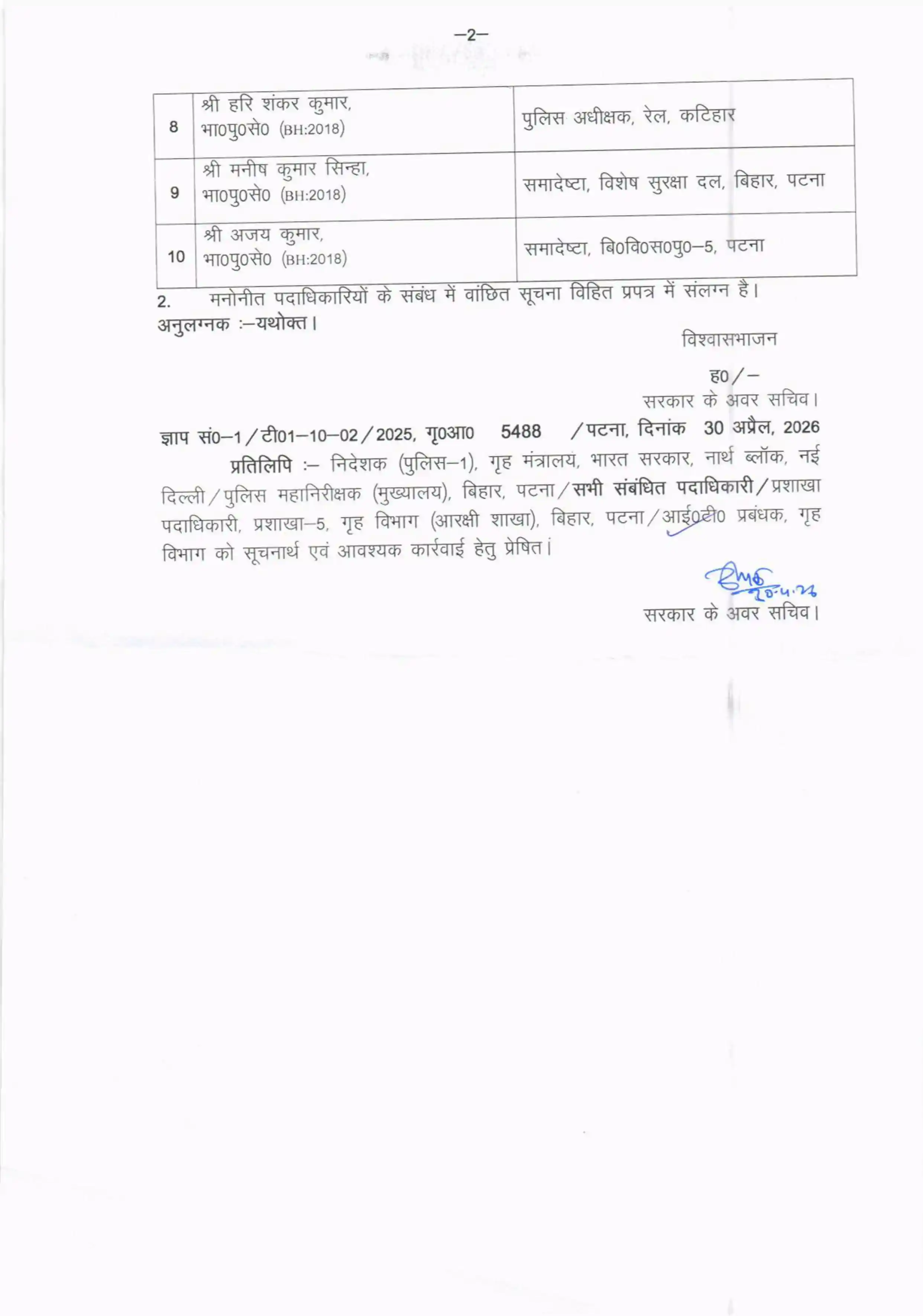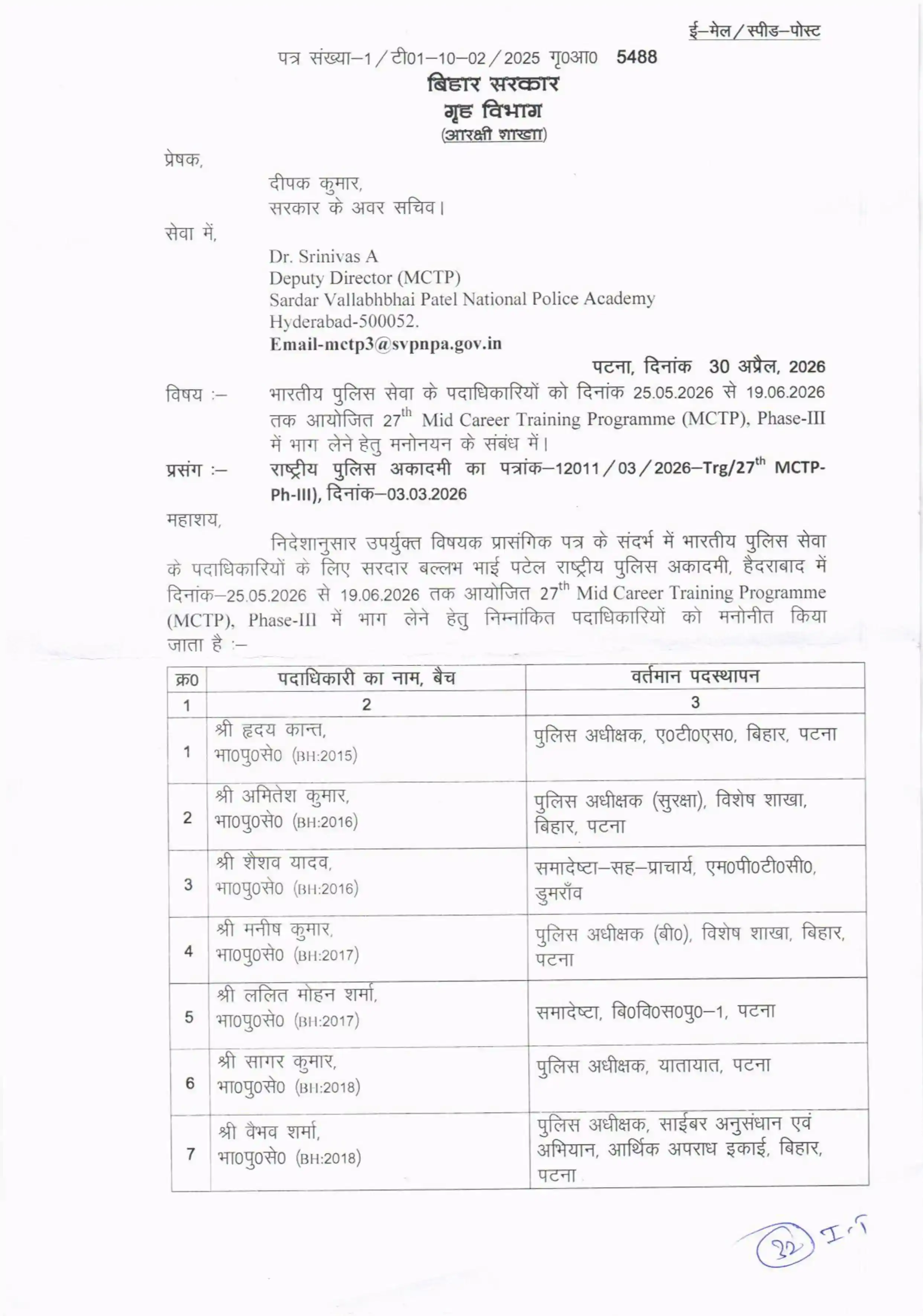बिहार कैडर के 10 आईपीएस अधिकारी 25 मई से 19 जून तक हैदराबाद स्थित सरदार वल्लभभाई पटेल राष्ट्रीय पुलिस अकादमी में प्रशिक्षण लेंगे। मिड करियर ट्रेनिंग प्रोग्राम (MCTP) के फेज-3 के लिए बिहार सरकार ने सूची जारी कर दी है।