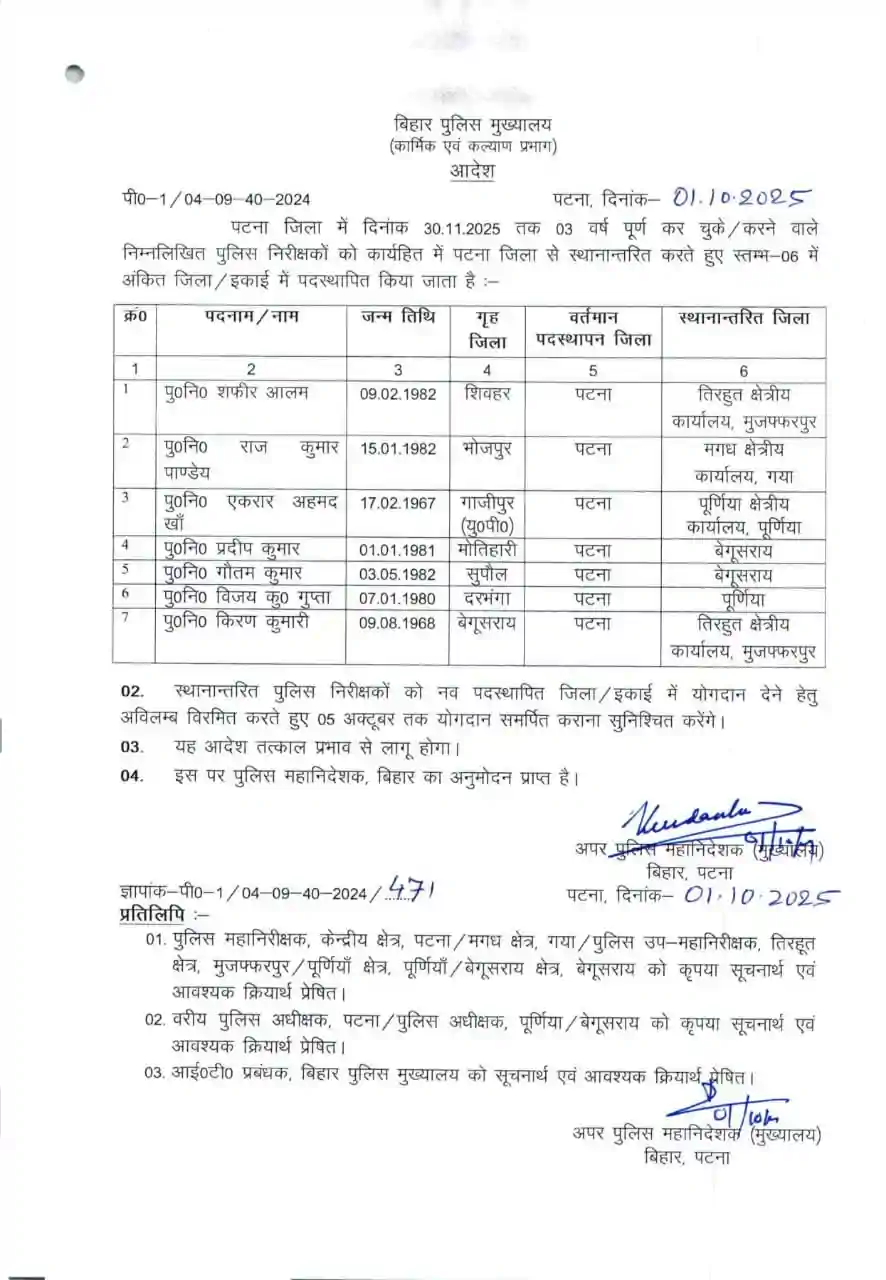 Bihar Police Transfer:पटना के थानेदार समेत कई पुलिस इंस्पेक्टरों का हुआ ट्रांसफर,यहां देखें लिस्ट