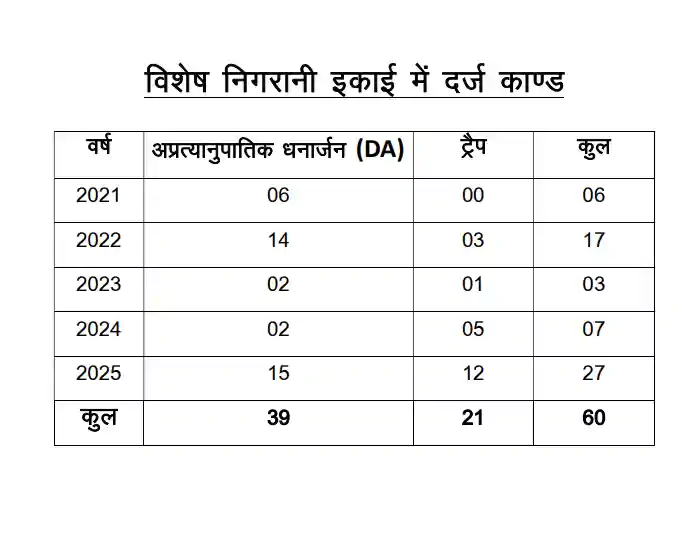 दरअसल, विशेष निगरानी इकाई का गठन राज्य के निगरानी विभाग को अधिक सशक्त बनाने और भ्रष्टाचार निवारण से जुड़े मामलों में प्रभावी कार्रवाई सुनिश्चित करने के उद्देश्य से किया गया था। ब्यूरो की रिपोर्ट के अनुसार वर्ष 2025 में अब तक विशेष निगरानी इकाई द्वारा कुल 27 प्राथमिकी दर्ज की जा चुकी हैं। इनमें 15 मामले आय से अधिक संपत्ति से जुड़े हैं, जबकि 12 मामले रिश्वत लेते रंगे हाथ पकड़े जाने (ट्रैप केस) से संबंधित हैं। निगरानी ब्यूरो का कहना है कि यह आंकड़ा बीते वर्षों की तुलना में अब तक का सर्वाधिक है।