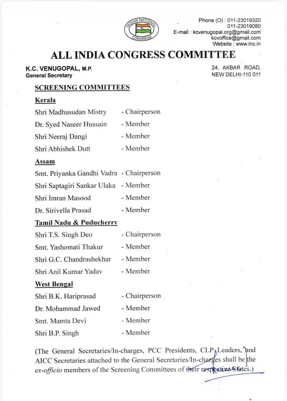 पूर्वोत्तर भारत में पार्टी की सक्रियता बढ़ाते हुए प्रियंका गांधी वाड्रा को असम की स्क्रीनिंग कमेटी का अध्यक्ष नियुक्त किया गया है। उनके साथ सप्तगिरि शंकर उलाका, इमरान मसूद और डॉ. सिरिवेला प्रसाद को सदस्य के रूप में शामिल किया गया है। वहीं केरल के लिए अनुभवी नेता मधुसूदन मिस्त्री को अध्यक्ष बनाया गया है। इस कमेटी में डॉ. सैयद नसीर हुसैन, नीरज डांगी और अभिषेक दत्त सदस्य होंगे।