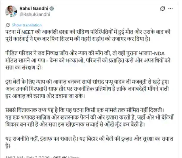 कांग्रेस सांसद राहुल गांधी ने इस कार्रवाई को राजनीतिक प्रतिशोध करार दिया है। उन्होंने सोशल मीडिया मंच X पर लिखा कि NEET की आकांक्षी छात्रा की संदिग्ध मौत और उसके बाद की कार्रवाई ने सिस्टम के गहरे षड्यंत्र को उजागर कर दिया है। राहुल गांधी ने आरोप लगाया कि निष्पक्ष जांच की मांग करने वालों को प्रताड़ित किया जा रहा है और अपराधियों को सत्ता का संरक्षण मिल रहा है यही भाजपा-NDA का मॉडल है।