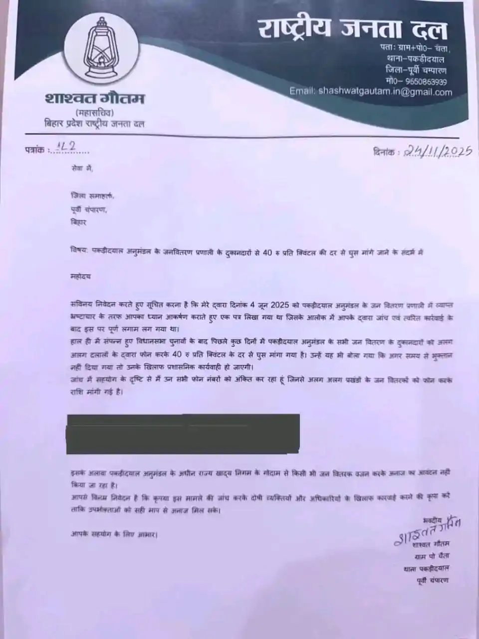 इतना ही नहीं, पूर्व की ‘बाकी’ कमीशन की वसूली के लिए भी डीलरों पर दबाव बनाए जाने की बात सामने आई है। राजद नेता शाश्वत गौतम ने अपने फेसबुक अकाउंट पर आवेदन की कॉपी साझा की है, जिसके बाद सोशल मीडिया पर मामला और गरम हो गया है। लोग तंज कस रहे हैं कि कमीशनखोरी के खेल में गरीबों की थाली से हर महीने एक किलो राशन गायब हो जा रहा है।