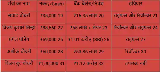 यहाँ बिहार के प्रमुख मंत्रियों की संपत्ति का विस्तृत विवरण दिया गया है: