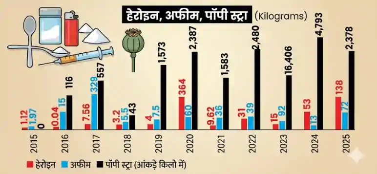 इसी तरह हेरोइन, अफीम और पॉपी स्ट्रॉ की बरामदगी भी लगातार बढ़ रही है। जैसे 2015: हेरोइन 1.12, अफीम 1.97, पॉपी स्ट्रॉ 0, 2016: हेरोइन 116, अफीम 1.04, पॉपी स्ट्रॉ 16, 2017: हेरोइन 557, अफीम 7.56, पॉपी स्ट्रॉ 329, 2018: हेरोइन 3.2, अफीम 3.2, पॉपी स्ट्रॉ 0, 2019: हेरोइन 1.573, अफीम 4.5, पॉपी स्ट्रॉ 0, 2020: हेरोइन 2.387, अफीम 364, पॉपी स्ट्रॉ 0, 2021: हेरोइन 1.583, अफीम 9.62, पॉपी स्ट्रॉ 0, 2022: हेरोइन 4.480, अफीम 31, पॉपी स्ट्रॉ 3.9, 2023: हेरोइन 16.406, अफीम 1.5, पॉपी स्ट्रॉ 3.9, 2024: हेरोइन 4.793, अफीम 53, पॉपी स्ट्रॉ 0, 2025: हेरोइन 2.378, अफीम 138, पॉपी स्ट्रॉ 0 (सभी मात्रा किलो में) में बरामद हुआ।