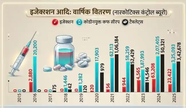 बिहार में नशीले इंजेक्शन, कोडीन युक्त कफ सिरप और टैबलेट्स के दुरुपयोग के मामले तेजी से बढ़ रहे हैं। जैसे 2016: 12,880 इंजेक्शन और 20,200 कोडीन युक्त कफ सिरप बरामद हुआ जो 2017: 75 इंजेक्शन, 446 कफ सिरप, 25 टैबलेट्स, 2018: 42 इंजेक्शन, 282 कफ सिरप, 20 टैबलेट्स, 2019: 20 इंजेक्शन, 10 कफ सिरप, 20 टैबलेट्स, 2020: 979 इंजेक्शन, 1,79,803 कफ सिरप, 56 टैबलेट्स, 2021: 9,144 इंजेक्शन, 6,19,084 कफ सिरप, 10,16,184 टैबलेट्स, 2022: 58,259 इंजेक्शन, 1,28,290 कफ सिरप, 58,223 टैबलेट्स, 2023: 11,549 इंजेक्शन, 1,15,440 कफ सिरप, 1,87,993 टैबलेट्स, 2024: 63,206 इंजेक्शन, 2,07,405 कफ सिरप, 3,05,071 टैबलेट्स और 2025: 23,422 इंजेक्शन, 3,25,093 कफ सिरप, 3,42,678 टैबलेट्स के रूप में बरामद हुआ। ये आंकड़े इस बात की गवाही देते हैं कि राज्य में सूखे नशे का कारोबार तेजी से बढ़ रहा है जिससे युवाओं का बड़ा वर्ग प्रभावित है।