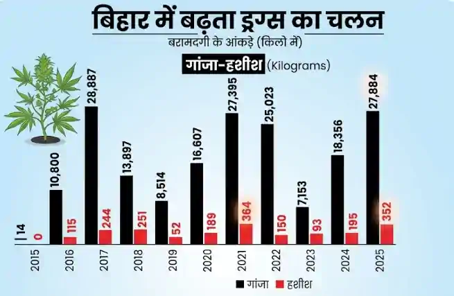शराब पर सख्ती के बीच बिहार में ‘ड्राई ड्रग्स’ का कारोबार तेजी से फैल रहा है। नारकोटिक्स कंट्रोल ब्यूरो की सालाना रिपोर्ट और बिहार विधानसभा में पेश सरकार के आंकड़े बताते हैं कि 2016: 1,08,000 किलो गांजा, 115 किलो चरस, 2017: 28,887 किलो गांजा, 244 किलो चरस, 2018: 13,897 किलो गांजा, 251 किलो चरस, 2019: 8,514 किलो गांजा, 52 किलो चरस, 2020: 16,607 किलो गांजा, 189 किलो चरस, 2021: 27,359 किलो गांजा, 364 किलो चरस, 2022: 25,023 किलो गांजा, 150 किलो चरस, 2023: 7,153 किलो गांजा, 59 किलो चरस, 2024: 18,356 किलो गांजा, 195 किलो चरस, और 2025: 27,884 किलो गांजा, 352 किलो चरस बरामद हुआ। इन आंकड़ों से साफ है कि 2016 में गांजा की बरामदगी में अचानक भारी उछाल आया, इसके बाद कुछ वर्षों तक गिरावट रही, लेकिन 2020 के बाद फिर से तेजी देखी गई और 2025 तक यह फिर उच्च स्तर पर पहुंच गई।