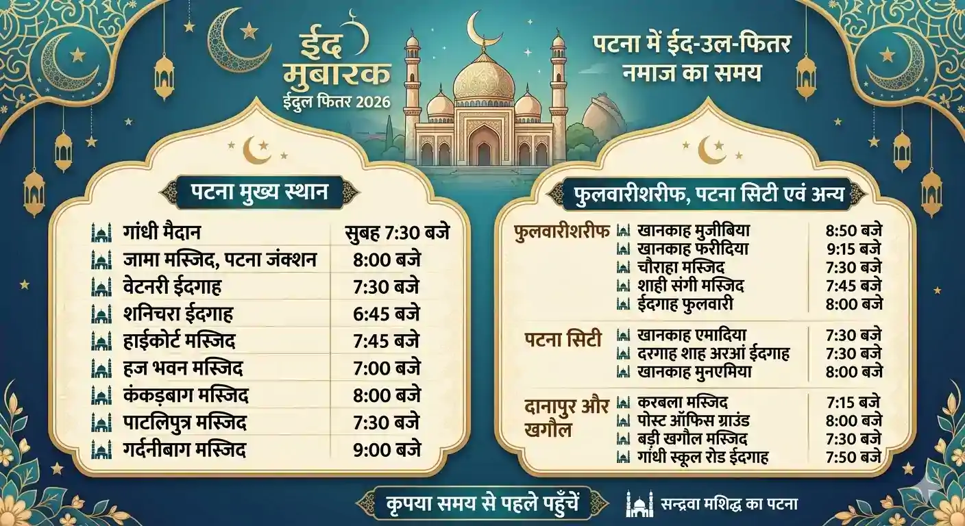 गांधी मैदान में सुबह 7:30 बजे मुख्य नमाज अदा की जाएगी। नमाजियों की सुविधा के लिए गेट नंबर 4, 5, 7 और 10 से प्रवेश की व्यवस्था की गई है। इसके अलावा पटना जंक्शन स्थित जामा मस्जिद, फुलवारीशरीफ और अन्य ईदगाहों में भी नमाज के अलग-अलग समय तय किए गए हैं।