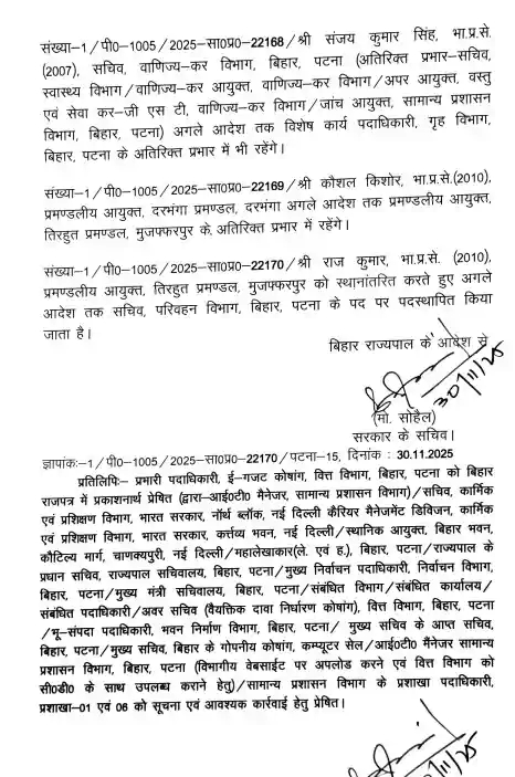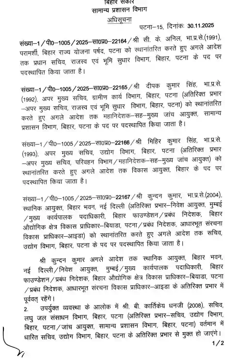 Patna - बिहार सरकार के सामान्य प्रशासन विभाग ने 30 नवंबर 2025 को एक बड़ी प्रशासनिक फेरबदल करते हुए भारतीय प्रशासनिक सेवा (IAS) के कई वरिष्ठ अधिकारियों का तबादला और पदस्थापन किया है । इस अधिसूचना के तहत राज्य के कई महत्वपूर्ण विभागों जैसे उद्योग, परिवहन, राजस्व एवं भूमि सुधार और सामान्य प्रशासन विभाग में नए सिरे से जिम्मेदारियां सौंपी गई हैं । यह बदलाव तब किया गया है, जब कल से 18वें विधानसभा का पहला सत्र शुरू होने जा रहा है।