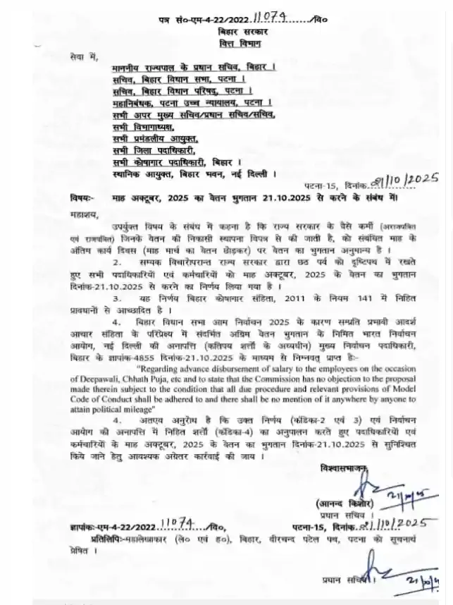 वित्त विभाग के प्रधान सचिव आनंद किशोर की ओर से जारी लेटर में बताया गया कि सभी अराजपत्रित और राजपत्रित कर्मचारियों का वेतन संबंधित माह के अंतिम कार्य दिवस पर अनुमानित रूप से भुगतान किया जाता है। लेकिन इस बार छठ पर्व और विधानसभा चुनाव (पहला चरण 6 नवंबर 2025) को ध्यान में रखते हुए वेतन 21 अक्टूबर से भुगतान सुनिश्चित किया जाएगा।