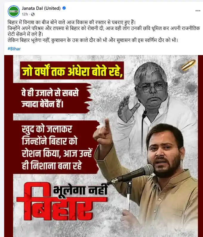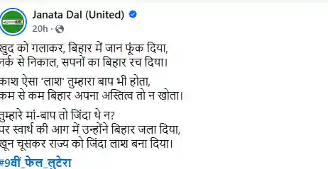 जवाब देने में जदयू ने भी देर नहीं की। सत्तारूढ़ दल ने तीखा पलटवार करते हुए लिखा “खुद को गलाकर, बिहार में जान फूंक दिया, नर्क से निकाल, सपनों का बिहार रच दिया। काश ऐसी लाश तुम्हारा बाप भी होता, कम से कम बिहार अपना अस्तित्व तो न खोता।” इतना ही नहीं, आगे लिखा गया “तुम्हारे मां-बाप तो जिंदा थे न? पर स्वार्थ की आग में उन्होंने बिहार जला दिया, खून चूसकर राज्य को जिंदा लाश बना दिया।” पोस्ट के साथ ‘9वीं फेल लुटेरा’ हैशटैग भी जोड़ा गया।
