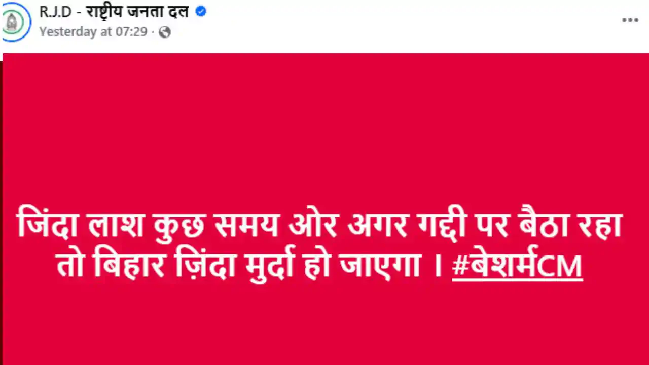 सबसे पहले वार राजद की ओर से हुआ। पार्टी के आधिकारिक फेसबुक पेज पर पोस्ट किया गया-“अगर जिंदा लाश कुछ समय और गद्दी पर बैठा रहा तो बिहार जिंदा मुर्दा बन जाएगा।” इस टिप्पणी के साथ लगाए गए हैशटैग को सीधे तौर पर मुख्यमंत्री नीतीश कुमार पर निशाना माना गया। पोस्ट सामने आते ही सियासी हलकों में हलचल मच गई और इसे व्यक्तिगत हमला करार दिया गया।