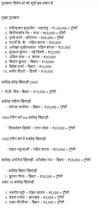 पुरस्कार वितरण के दौरान खेल मंत्री श्रेयसी सिंह ने खिलाड़ियों का उत्साहवर्धन करते हुए कहा कि 2036 के ओलंपिक खेलों को ध्यान में रखते हुए बिहार के खिलाड़ियों को वैश्विक मंच के लिए तैयार करना सरकार की प्राथमिकता है। उन्होंने खेल को एक जन आंदोलन बनाने और राज्य से अधिक से अधिक सहभागिता सुनिश्चित करने पर जोर दिया। कार्यक्रम में बिहार राज्य खेल प्राधिकरण के महानिदेशक रवींद्रण शंकरण और सचिव धर्मेंद्र कुमार समेत शतरंज जगत की कई नामचीन हस्तियां मौजूद रहीं। प्रतियोगिता में बिहार के खिलाड़ियों का भी दबदबा रहा। मरियम फातिमा को सर्वश्रेष्ठ महिला खिलाड़ी और पी.के. सिंह को सर्वश्रेष्ठ वरिष्ठ खिलाड़ी (S60) का पुरस्कार मिला। साथ ही, विभिन्न आयु वर्गों (अंडर-7 से अंडर-15) में बिहार के नन्हे शतरंजबाजों ने ट्रफियों पर कब्जा जमाकर अपनी प्रतिभा का लोहा मनवाया। विजेता इंद्रजीत को एक लाख रुपये की नकद राशि और चमचमाती ट्रॉफी प्रदान की गई।