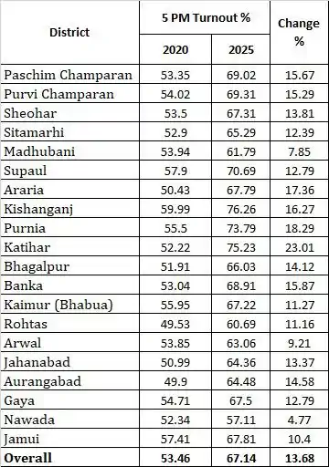 PATNA - बिहार चुनाव के दूसरे चरण में लगभग हर जिले में बंपर वोटिंग हुई है। दूसरे चरण में बिहार की सीमाओं से जुड़े जिन 20 जिलों में वोटिंग हुई है, उनमें नवादा को छोड़ सभी जगह शाम पांच बजे तक वोटिंग का परसेंट 60 के पार हो गया है।