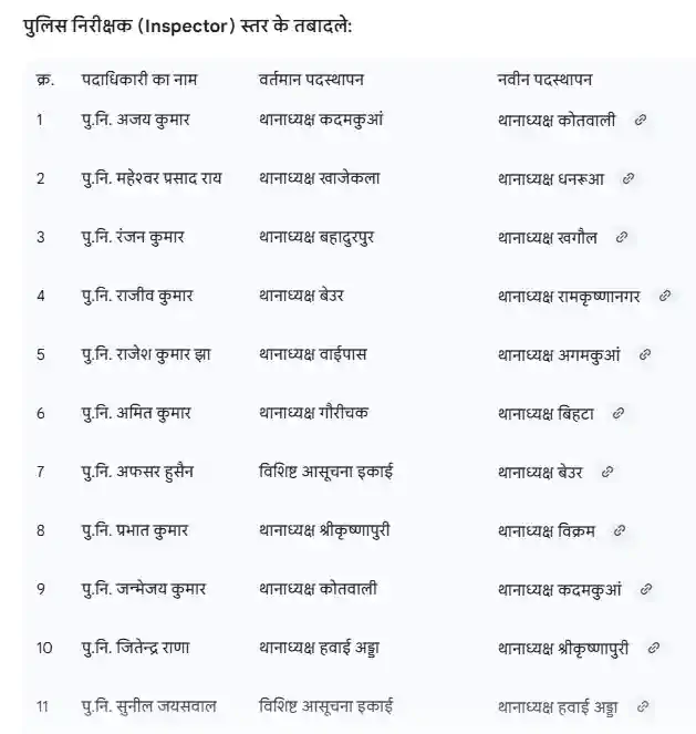 प्रमुख थानों में हुआ बदलाव शहर के कई महत्वपूर्ण थानों के थानेदार बदले गए हैं। कदमकुआं के तत्कालीन थानाध्यक्ष पु.नि. अजय कुमार को अब कोतवाली थाने की जिम्मेदारी सौंपी गई है, जबकि कोतवाली के थानाध्यक्ष पु.नि. जन्मेजय कुमार को कदमकुआं का नया थानाध्य…