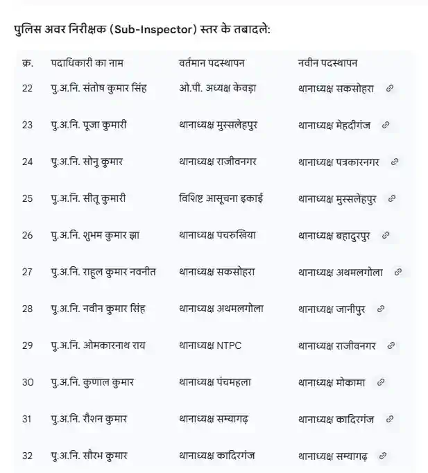 पटना वरीय पुलिस अधीक्षक (SSP) कार्यालय द्वारा प्रशासनिक दृष्टिकोण और कार्यहित को देखते हुए जिले में बड़े पैमाने पर पुलिस पदाधिकारियों का स्थानांतरण और पदस्थापन किया गया है । शुक्रवार को जारी इस आदेश सूची में कुल 46 पुलिस निरीक्षक (इंस्पेक्टर) और पुलिस अवर निरीक्षक (सब-इंस्पेक्टर) स्तर के अधिकारियों के नाम शामिल हैं, जिन्हें तत्काल प्रभाव से नए स्थानों पर योगदान देने का निर्देश दिया गया है ।
