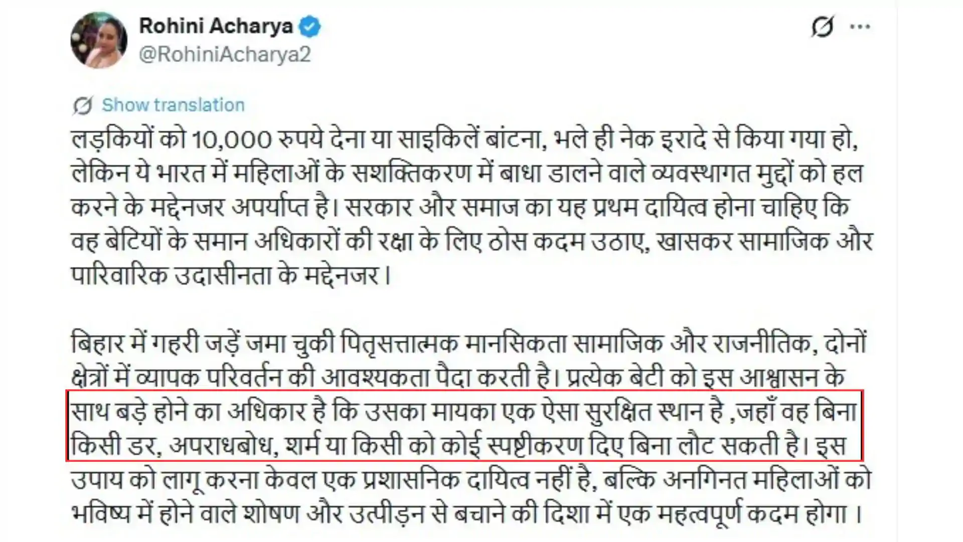 यह भी सच है कि रोहिणी वही बेटी हैं, जिन्होंने लालू प्रसाद को 'जीवनदान' देने के लिए आगे बढ़कर अपनी किडनी दी थी। जिस बेटी ने पिता के लिए इतना बड़ा त्याग किया हो, उसकी नाराजगी भी उतनी ही गहरी थी। उनके परिवार छोड़ने पर लालू-राबड़ी के भावुक होने की चर्चा भी खूब हुई थी। अब उनकी नई पोस्ट उस टूटे रिश्ते में पिघलन का संकेत दे रही है। रोहिणी ने महिला सशक्तिकरण और नीतीश सरकार की ₹10,000 वाली योजना पर निशाना साधा था, और इसी आलोचना के बीच 'मायका' जैसी भावनात्मक पंक्ति लिखना RJD खेमे के भीतर परिवार के करीब लौटने के संकेत के तौर पर देखा गया।