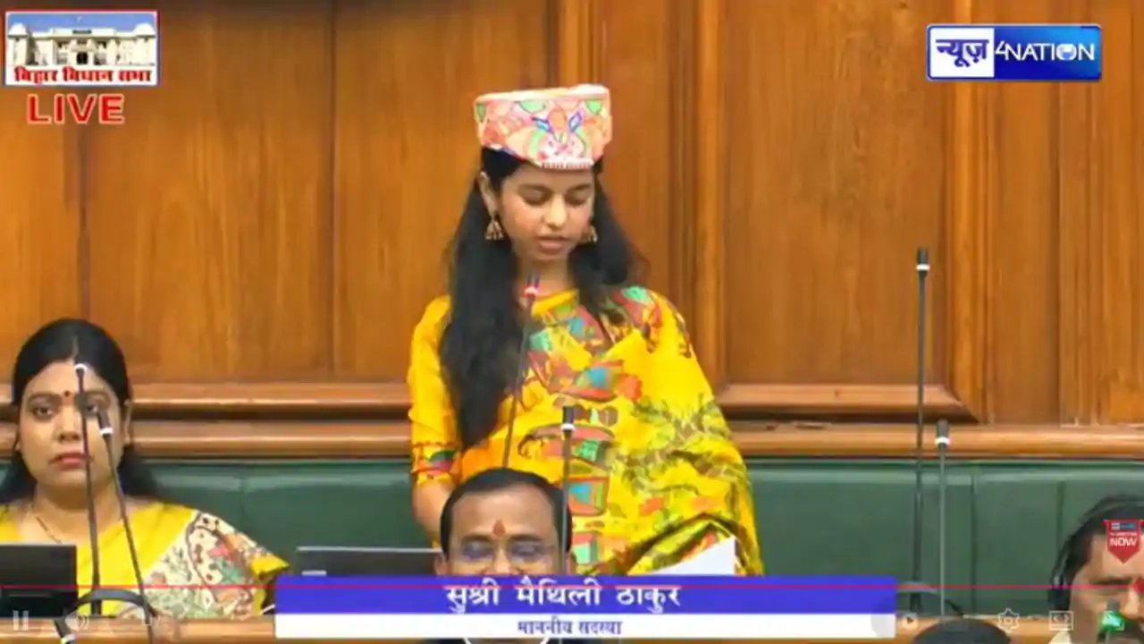 Bihar Vidhansabha Session : बिहार की सबसे कम उम्र की विधायक मैथिली ठाकुर ने अलग अंदाज में शपथ ग्रहण की। उन्होंने मैथिली भाषा में शपथ लिया।