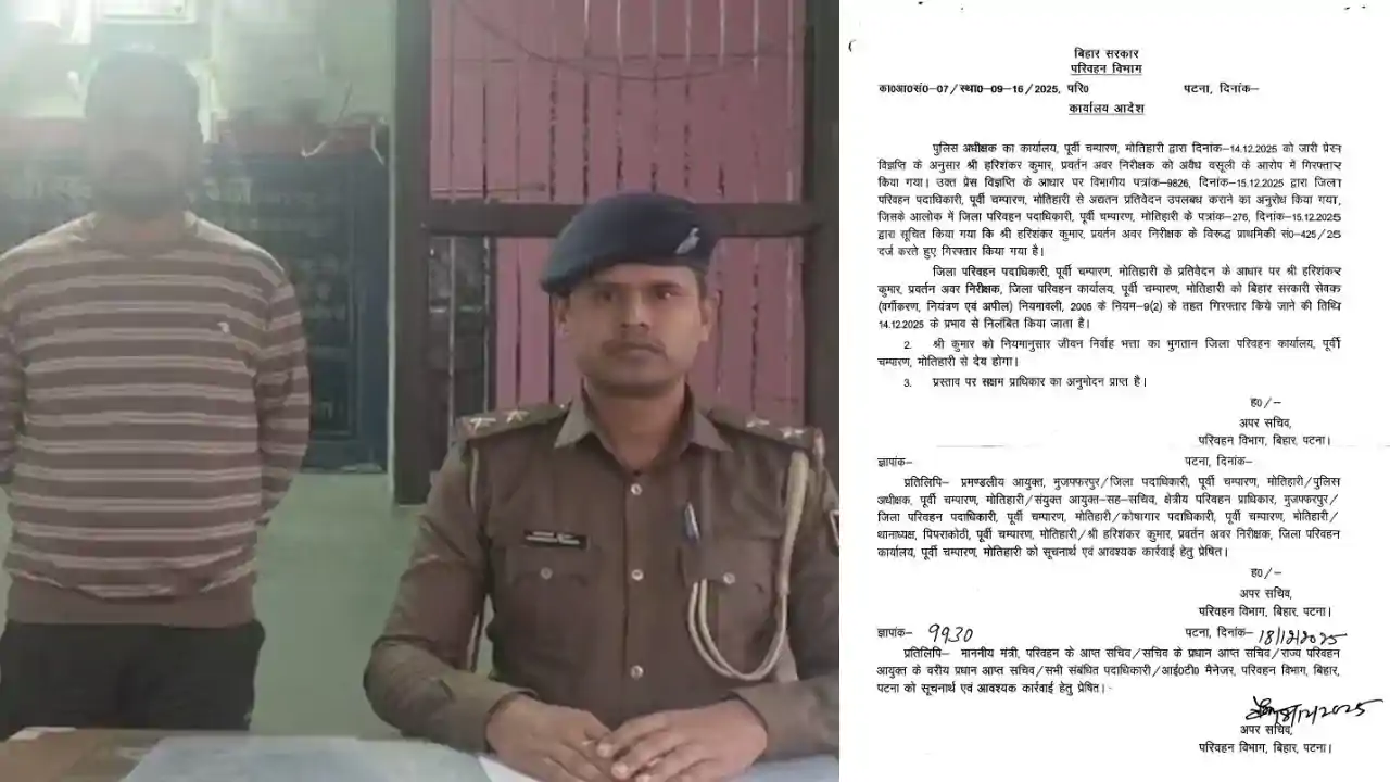 पुलिस अधीक्षक कार्यालय, पूर्वी चम्पारण द्वारा जारी सूचना के अनुसार, प्रवर्तन अवर निरीक्षक (ESI) हरिशंकर कुमार को अवैध वसूली करते हुए रंगे हाथों पकड़ा गया था। इस मामले में 14 दिसंबर 2025 को पुलिस ने उन्हें गिरफ्तार किया। पुलिस की इस कार्रवाई के बाद जिला परिवहन पदाधिकारी ने मामले की विस्तृत रिपोर्ट विभाग को सौंपी थी।