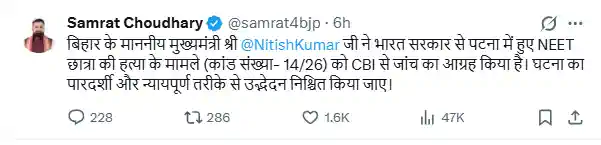 सम्राट चौधरी ने ट्विट कर लिखा कि, "बिहार के माननीय मुख्यमंत्री नीतीश कुमार जी ने भारत सरकार से पटना में हुए NEET छात्रा की हत्या के मामले (कांड संख्या- 14/26) को CBI से जांच का आग्रह किया है। घटना का पारदर्शी और न्यायपूर्ण तरीके से उद्भेदन निश्चित किया जाए"। सम्राट चौधरी ने कहा कि सीएम नीतीश ने इस मामले को सीबीआई के हाथों में सौंपने की अपील की है। जिसके बाद से ही तमाम सवाल खड़े हो रहे हैं। राजनीतिक जानकारों की मानें तो सरकार खुद को सुरक्षित करने और सवालों से बचने के लिए मामले को सीबीआई को सौंप रही है।