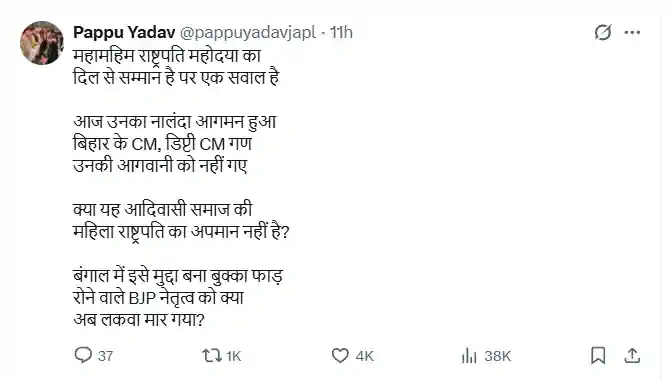 पप्पू यादव ने तंज कसते हुए कहा कि 'महामहिम राष्ट्रपति महोदया का दिल से सम्मान है पर एक सवाल है. आज उनका नालंदा आगमन हुआ बिहार के CM, डिप्टी CM गण उनकी आगवानी को नहीं गए.