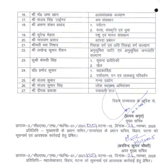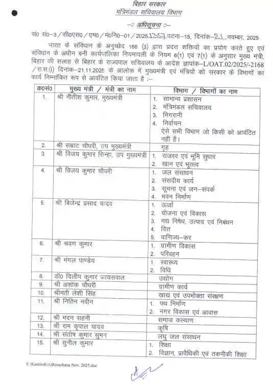 बिहार में नीतीश सरकार के नए कैबिनेट का गठन, नोटिफिकेशन जारी, जानें सभी मंत्रियों को मिला कौन सा विभाग